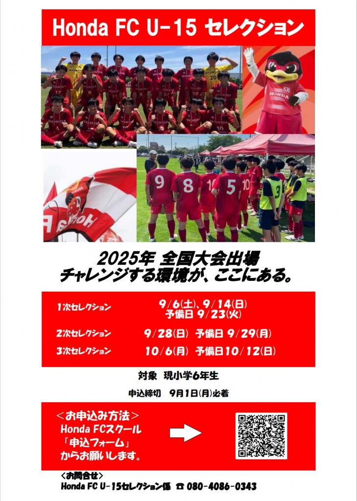 この度、2026年度新中学1年生(現小学6年生)を対象に、Honda FC U-15セレクションを開催しますのでお知らせします。