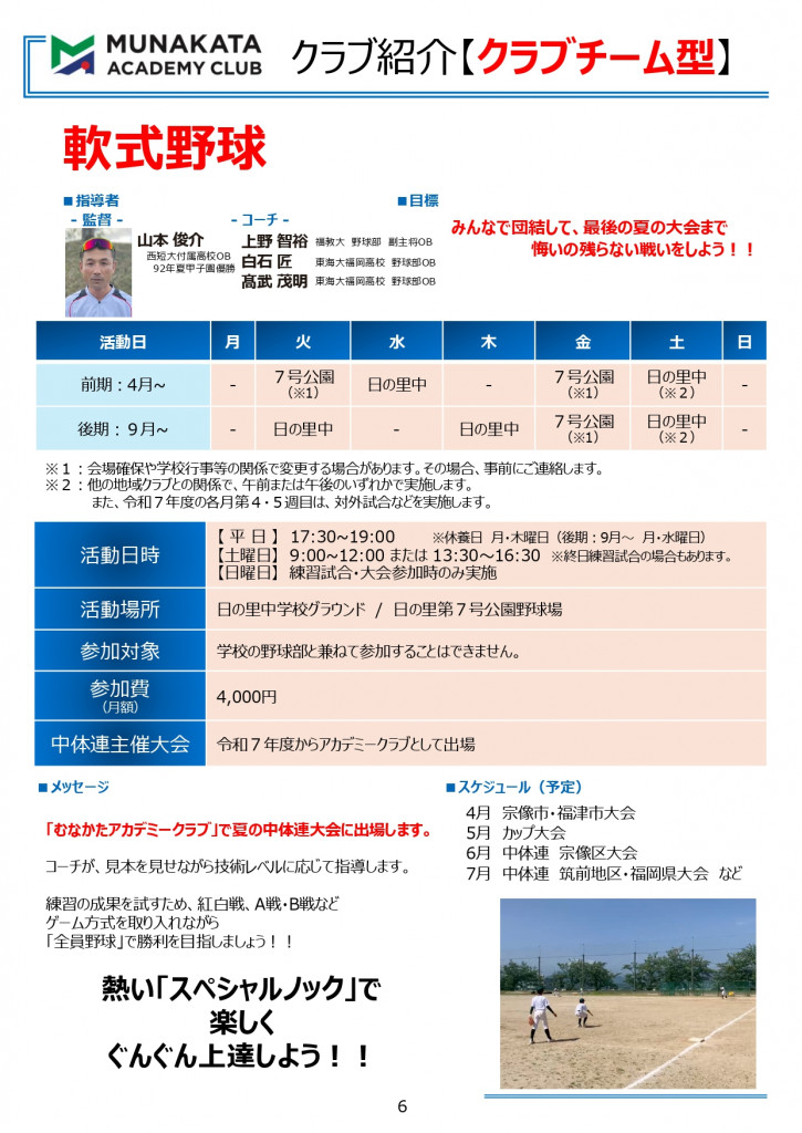 【⼟曜⽇】 9:00~12:00 または 13:30〜16:30 ※終⽇練習試合の場合もあります。