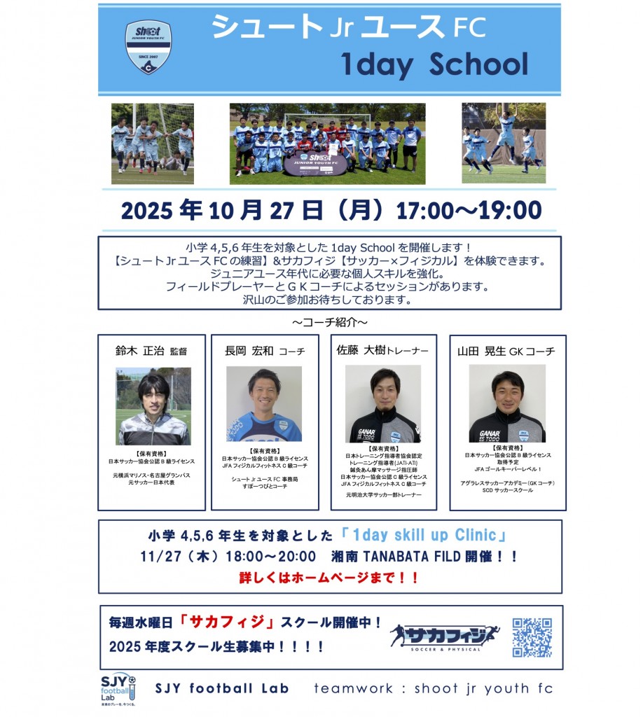 今回は、サカフィジ「サッカー×フィジカル」と「シュートJrユースFCの練習」を体験できます。ジュニアユース年代に必要な個人スキルを強化。フィールドプレーヤーはもちろんGKも参加できます。GKはGKコーチによるセッションがあります。