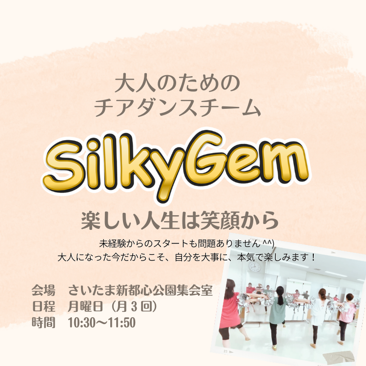 さいたま新都心駅から徒歩10分の距離に、大人のためのチアダンス活動をしています。流行りの曲からチアの定番の曲まで、チアダンスを満喫し、発表していくことはもちろんのこと、一人一人の個性が生き生きと輝く、ミセスチア・シニアチアダンスチームを目指します!随時体験会を実施しておりますので、ぜひお越しください! 問合せ先 さいたまスポーツコミッション小林 ☎048-762-8476